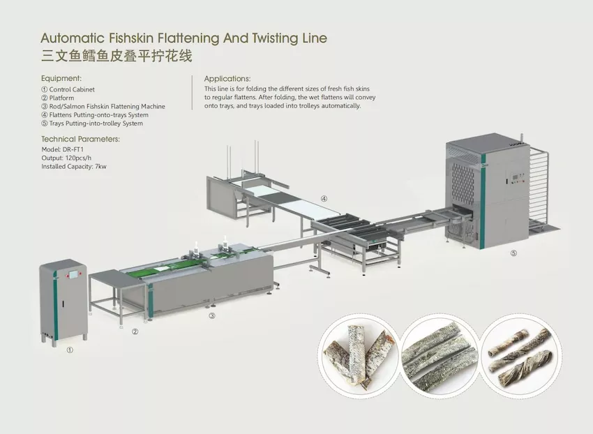 and cod fishskin treats. It integrates fishskin flattening, twisting, shaping, and conveying into a continuous